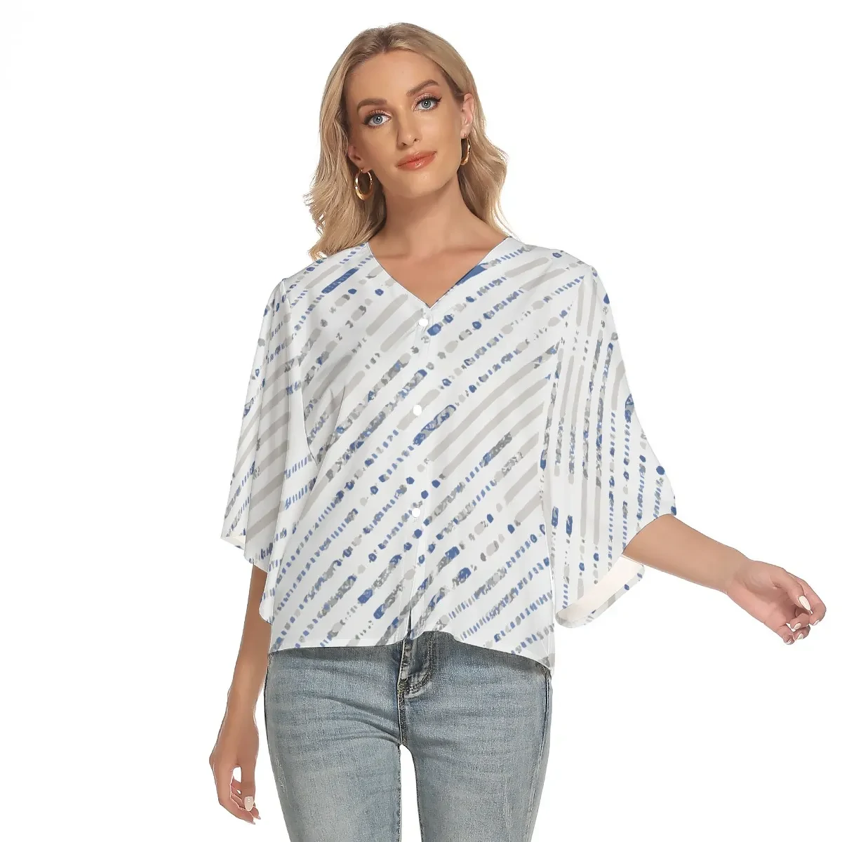 Looking for that perfect piece to stand out in the crowd? Look no further than the elegant bat sleeve v-neck top! This stylish blouse is the ultimate statement piece that will make you shine wherever you go. Its unique design and flattering silhouette will have you feeling confident and classy at any event. Pair it with your favorite jeans or dress it up with a skirt for a versatile and chic look. With this blouse, you'll be turning heads and receiving compliments left and right!