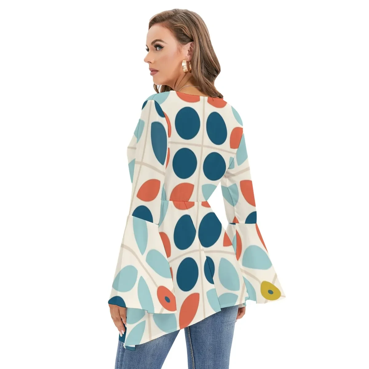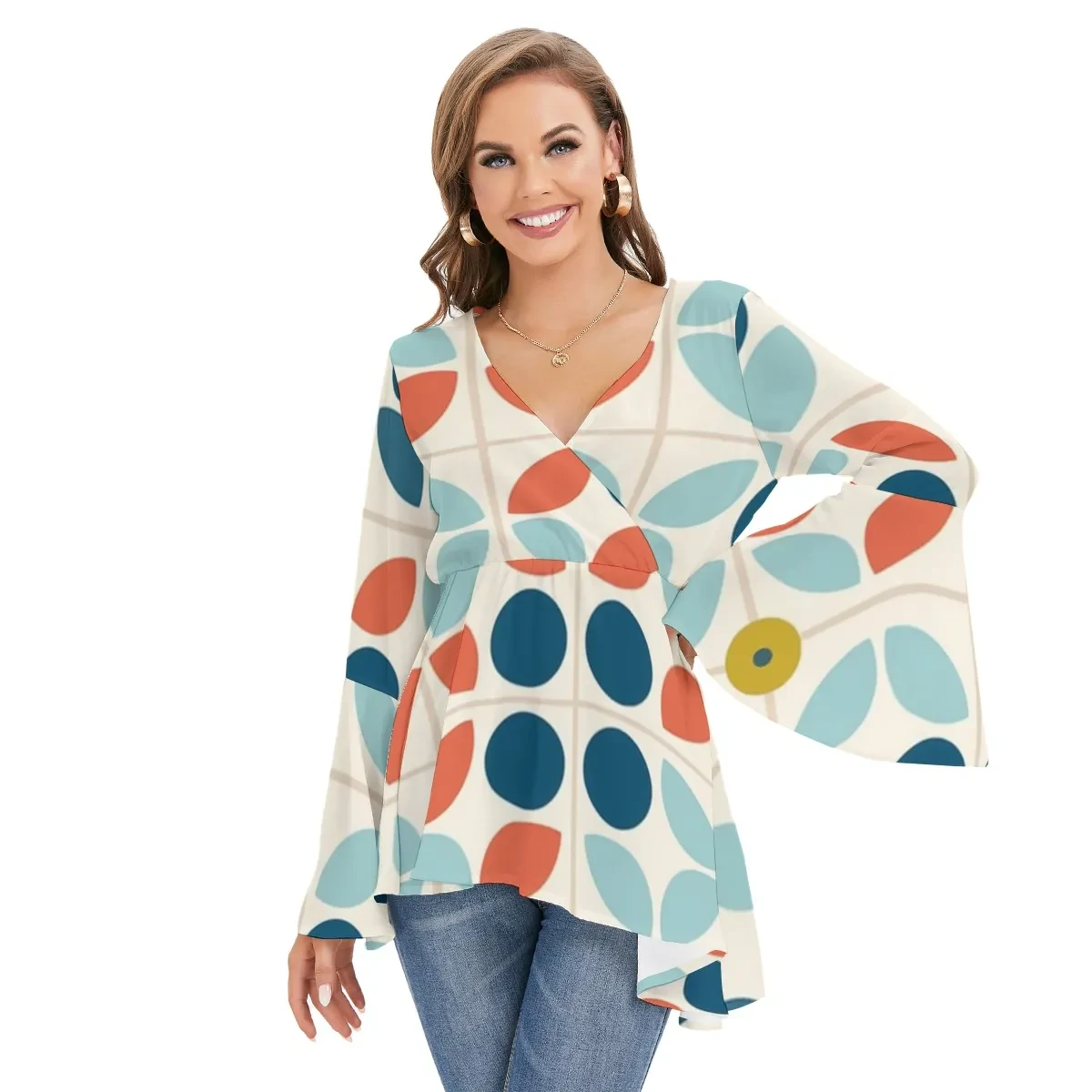 Ladies blouse with deep V folded collar, butterfly sleeve design, very fashionable