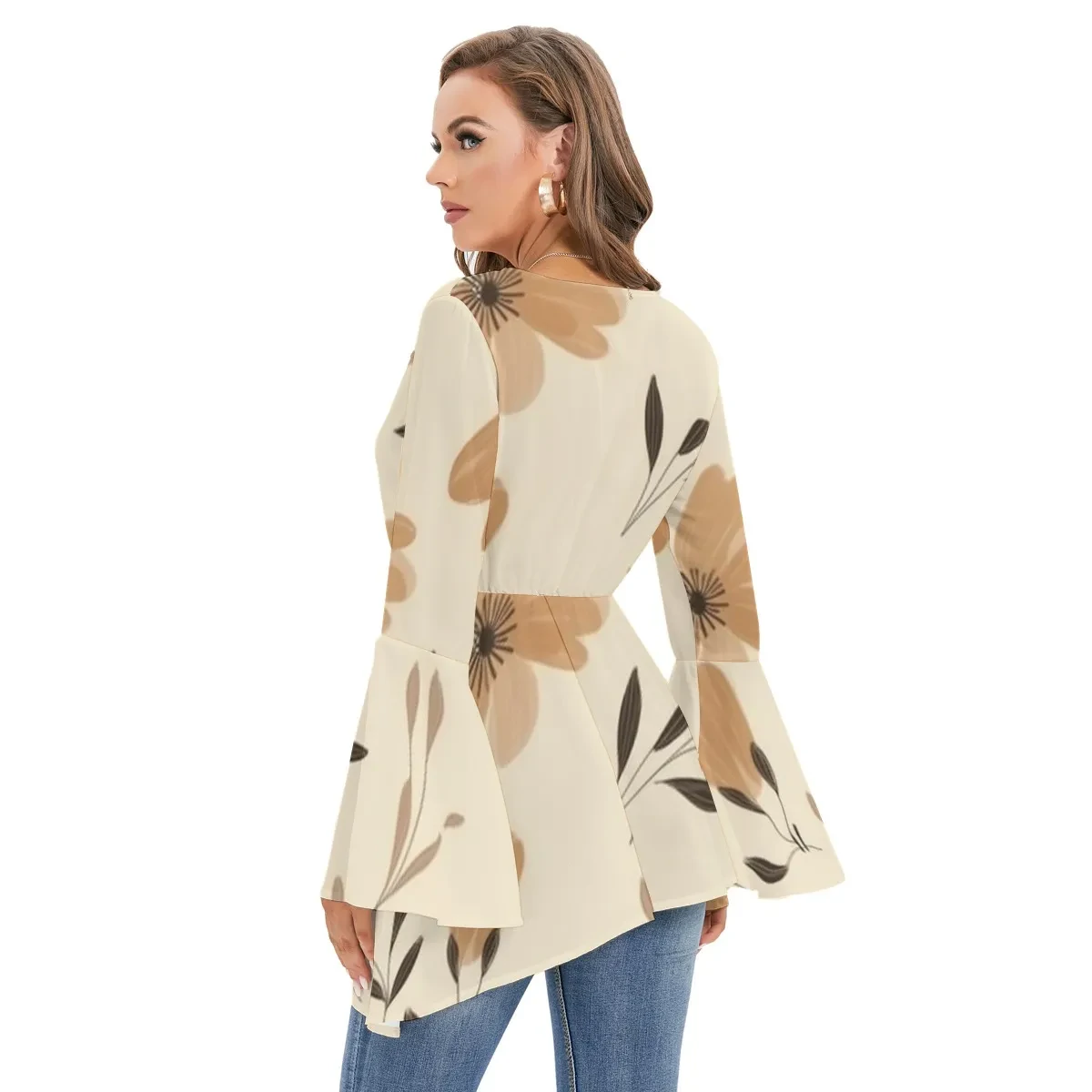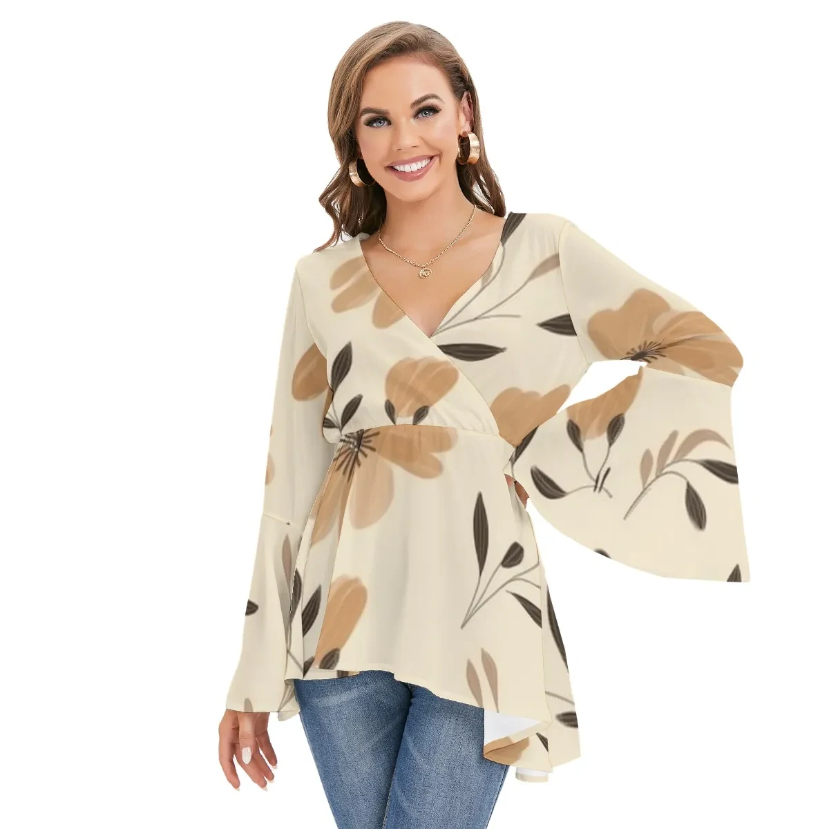 Motiff V-Neck Blouse with Flared Sleeves