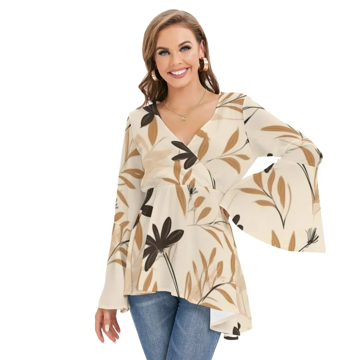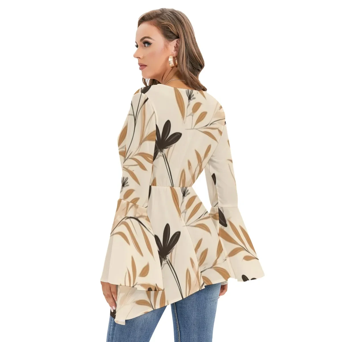 Ladies blouse with deep V folded collar, butterfly sleeve design, very fashionable